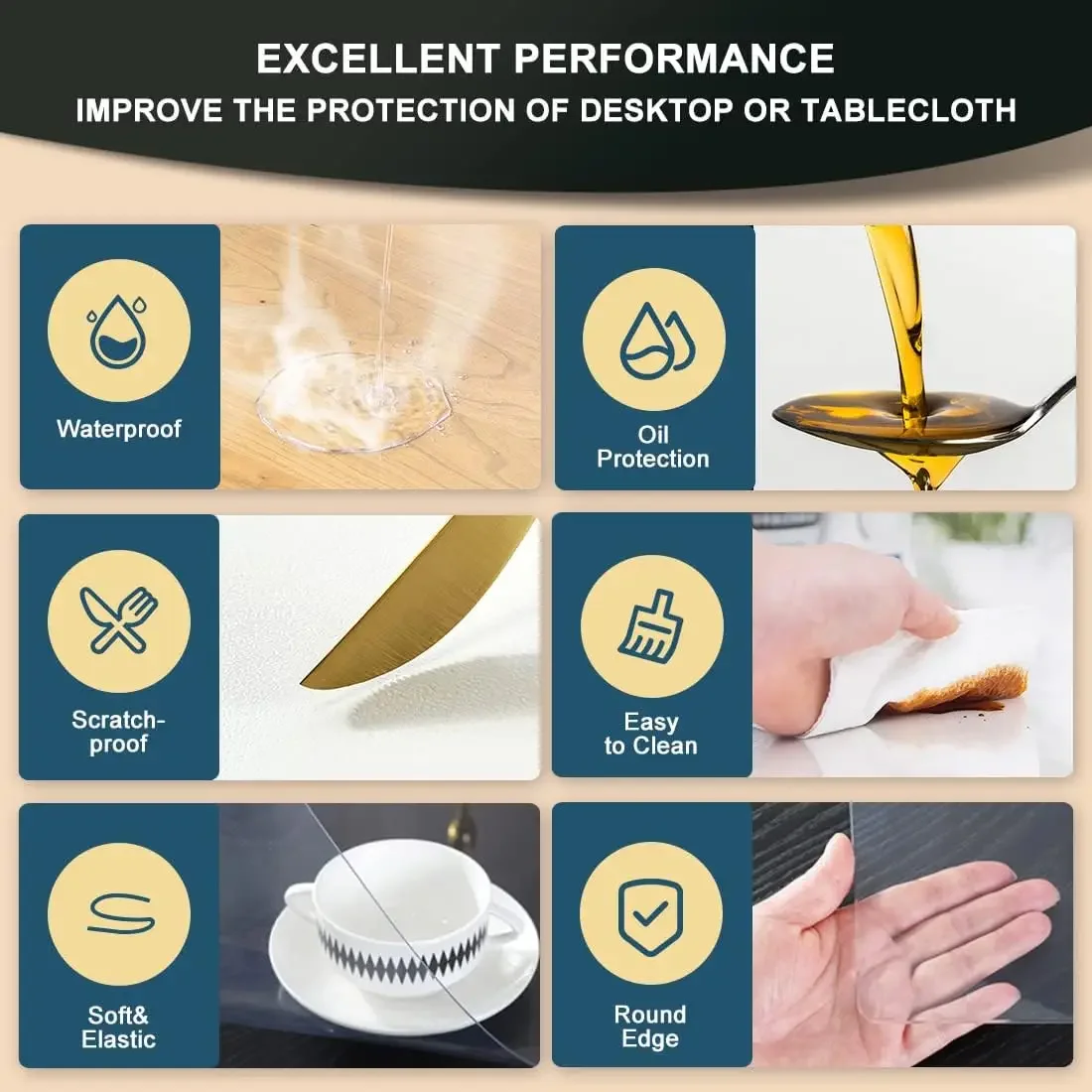 Made of soft and durable PVC plastic vinyl, hot pressed into rolls. This transparent PVC table cover is durable, waterproof and oil-proof.