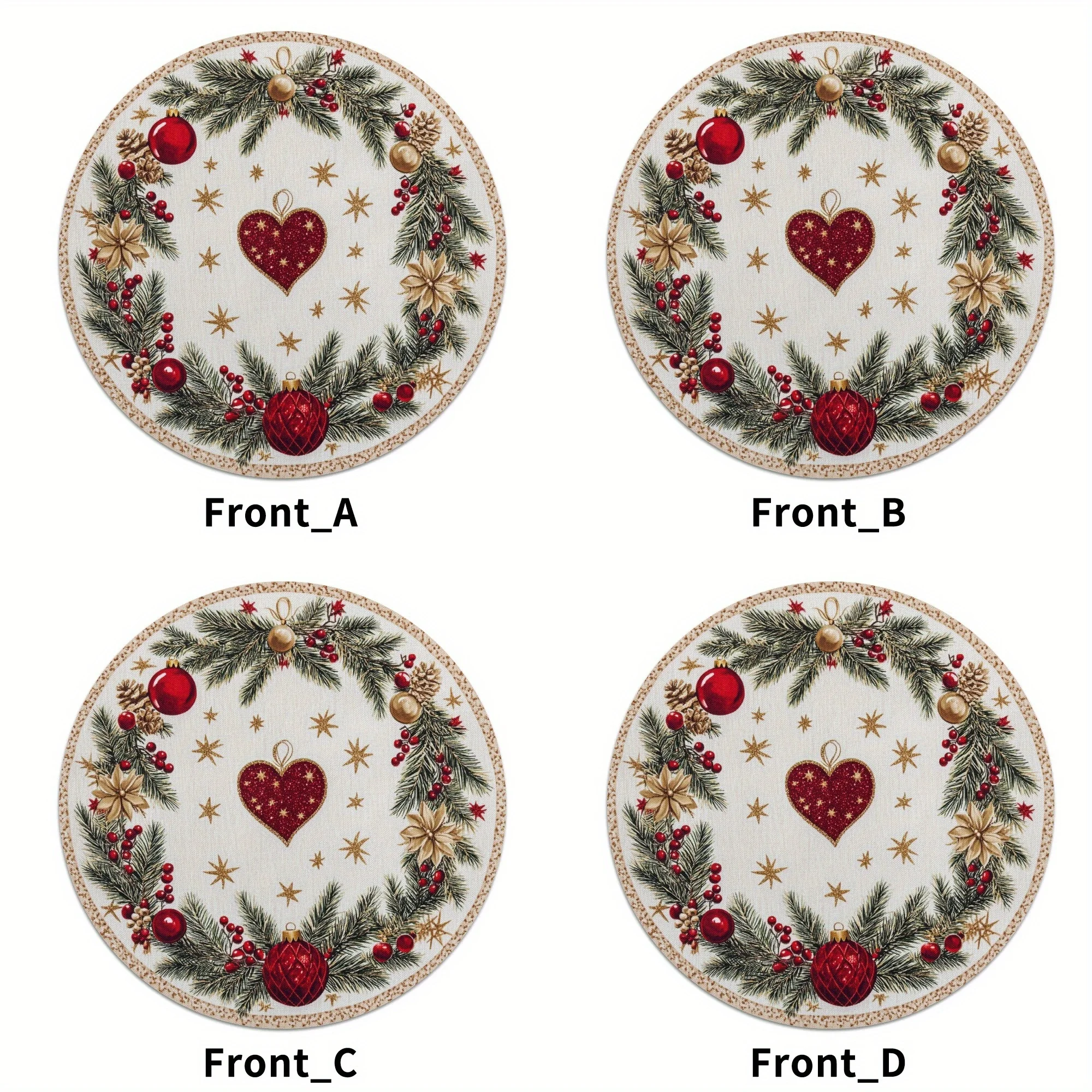 VIKAMA 4PC Christmas Round Placemats Red Background Snowflakes Holly Berries Waterproof Family Dinner Cafe Decoration
